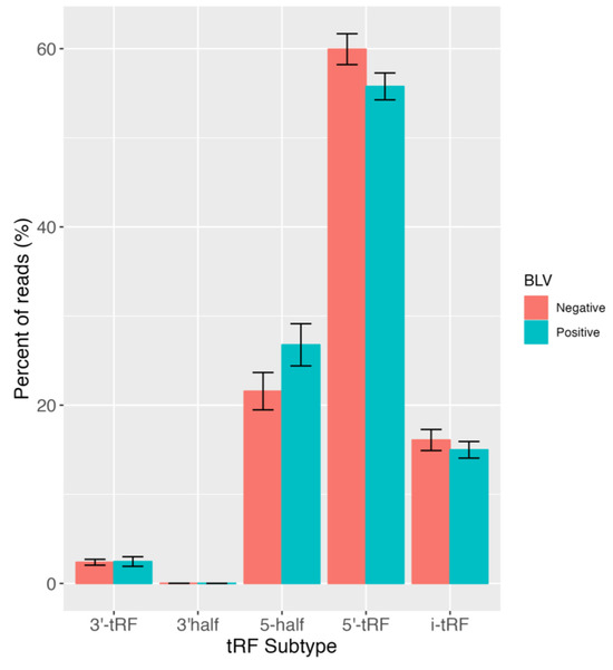 Distribution of tRF subtypes between progeny born to BLV positive and BLV negative dams. Bar graph showing the percentage of reads assigned to 5′ tRF, 3′ tRF, i-tRF, 5′ half and 3′ half subtypes. All reads were counts per million (CPM) normalized and percentages contributing to the total tRF profile were calculated. The y-axis sums to 100% for each BLV status and standard error bars are shown in black.