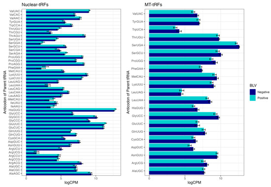 Nuclear and Mitochondrial tRF distribution between progeny born to BLV negative and BLV positive dams. Reads were logCPM normalized and the number of reads derived from each parent tRNA are shown. The SummarySE function of the Rmisc package was used to calculate summary statistics by treatment group and the standard error bars for each parent tRNA within each treatment group are shown.