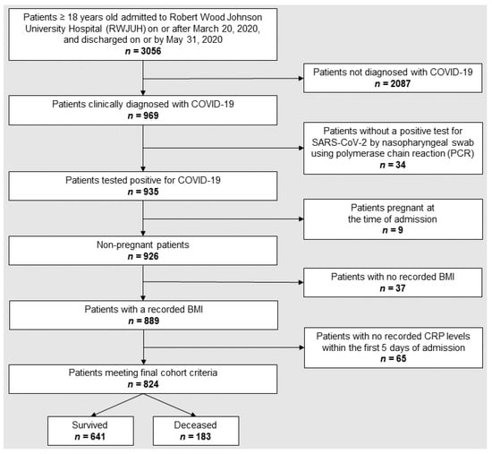 We performed a retrospective analysis of 969 adults who were diagnosed as having COVID-19 when admitted to Rutgers Robert Wood Johnson University Hospital (RWJUH), a Level 1 trauma center in New Jersey, from 20 March 2020 and discharged on or by 31 May 2020. The study and informed consent waiver were approved by the Rutgers Institutional Review Board (protocol Pro20201234), and all methods were performed in accordance with the relevant guidelines and regulations. Of 969 adults, only the 824 non-pregnant patients who tested positive for SARS-CoV-2 infection by nasopharyngeal swab using polymerase chain reaction (PCR), and with both BMI and CRP values recorded within the first 5 days of admission were included in our study. A flow chart depicting patient inclusion and exclusion criteria is shown in Figure 1. Details about the entire cohort were recently published []. In order to maintain sufficient statistical power for any subsequent analysis, patients who suffered from diseases that can affect baseline CRP values, such as intercurrent infections, autoimmune disorders, or other chronic or acute conditions, were not excluded from the cohort.