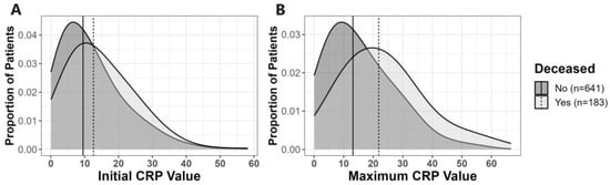 Distribution of initial and maximum CRP values among survivors and deceased. For each graph, the dashed black line represents the median of the corresponding CRP values among deceased patients, and the solid black lines represent the median of the corresponding CRP values among survivors. Panels: (A) distribution of initial CRP. For deceased patients, the median initial CRP was 12.60 (IQR: 7.46–21.24) vs. 9.52 (IQR: 4.82–16.43) mg/dL for those who survived (p < 0.001); (B) distribution of maximum CRP. For deceased patients, the median MAX CRP was 21.86 (IQR: 13.16–30.79) vs. 13.14 (IQR: 6.58–22.65) mg/dL for those who survived (p < 0.001).