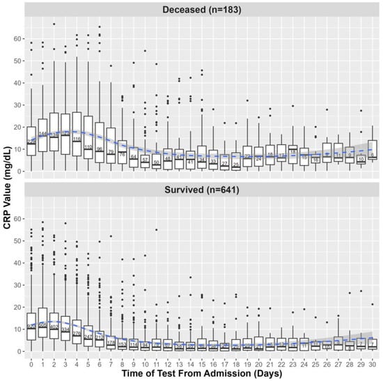 CRP levels within the first 30 days of hospital admission among survivors and deceased. The values shown on day 0 are defined by CRP values collected within the 24 h preceding hospital admission. Each boxplot shows the median and IQR of CRP values; points are outliers, and in each box is written the number of CRP values obtained on the corresponding day. The blue line represents a local regression plotting CRP values over time, and the shaded area corresponds to the 95% confidence interval of the regression.