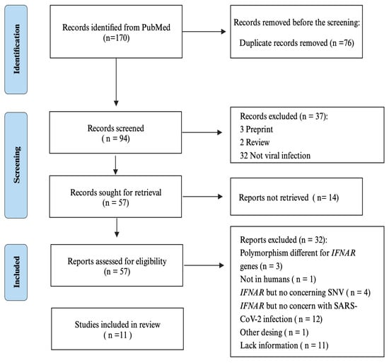 Following the PRISMA guidelines [], a comprehensive literature search was performed to identify relevant studies on “The association of IFNAR1 and IFNAR2 variants with COVID-19 severity or mortality in different populations”. The search aimed to identify studies published in English between January 2021 and February 2023.
