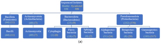 Specifically, compared to the healthy silks, the F. graminearum-infected silks had fewer isolates cultured from the phyla Bacillota, Actinomycetota, and Bacteriodota, and more isolates from Pseudomonadota (Figure 1b). Furthermore, there was a class-level shift towards more Betaproteobacteria (2% of isolates in the healthy silks versus 7% in the F. graminearum-infected silks) and especially more Gammaproteobacteria (55% of isolates in the healthy silks versus 80% in the F. graminearum-infected silks) (Figure 1 and Figure S2). The cultured microbiome of the F. graminearum-infected silks contained bacteria from the order Lysobacterales (Figure S3), which were not found in the non-infected silks []. Conversely, the cultured microbiome of the F. graminearum-infected silks was lacking bacteria from the orders Cytophagales and Propionibacteriales (Figure S3), which were cultured from the non-infected silks []. There were nine bacterial families (Alcaligenaceae, Aurantimonadaceae, Beutenbergiaceae, Enterococcaceae, Gordoniaceae, Intrasporangiaceae, Methylobacteriaceae, Micrococcaceae and Spirosomaceae) which were cultured from the healthy silks, but not the F. graminearum-treated silks, whereas there were only three families (Hafniaceae, Oxalobacteraceae and Rhodanobacteraceae) exclusively cultured from the F. graminearum-treated silks (Figures S4 and S8). The number of isolates cultured from the families Microbacteriaceae, Bacillaceae, Streptococcaceae and Weeksellaceae were notably reduced in the F. graminearum-treated silks (Figure S8). In contrast, specific families were cultured more frequently in the F. graminearum-treated silks, notably Comamonadaceae, Enterobacteriaceae, Erwiniaceae, Pseudomonadaceae and Xanthomonadaceae.