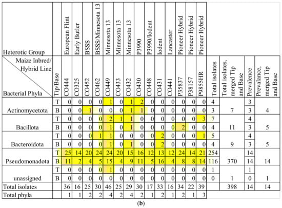 Transmitting silks of maize genotypes CO449 and CO432, belonging to the heterotic group Minnesota 13, gave rise to the greatest cultured bacterial diversity after infection with F. graminearum. They were the only genotypes to produce isolates from all four phyla, often in both the tip and the base (Figure 1b). These two genotypes gave rise to cultured bacteria from 10 and nine bacterial orders, respectively, and they each covered 12 bacterial families and 14 genera. Interestingly, the class Sphingobacteriia only appeared in the genotype CO449 (Minnesota 13); unique isolates of the genus Sphingobacterium appeared in both the tip and the base of this host genotype (Figure 2 and Figure S2).