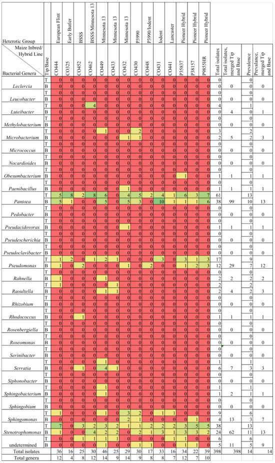 Comparison of the number of isolates belonging to the cultured healthy (non-infected) and the Fusarium graminearum-infected transmitting silk microbiomes at the genus taxonomic level. Isolates were cultured separately from the tip (T) and the base (B) of maize silks spanning diverse host inbred/hybrid lines and heterotic groups. Yellow-to-green cells indicate the presence of isolate(s). Red cells indicate the absence of isolates. Further details are found in Table S1.