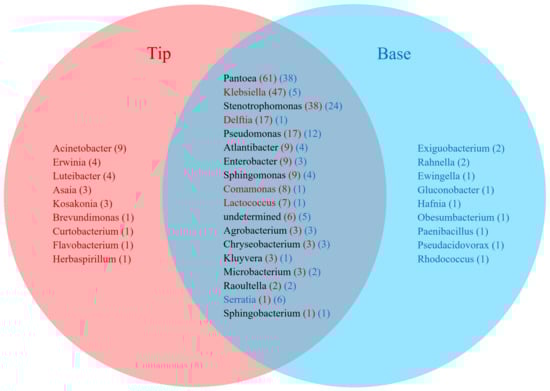 Comparison of bacterial genera which were cultured from the tip and/or the base tissues of F. graminearum-treated transmitting maize silks spanning diverse host inbred/hybrid lines and heterotic groups. Numbers in brackets indicate the number of isolates cultured: red from the tip and blue from the base. Further details are in Table S1.