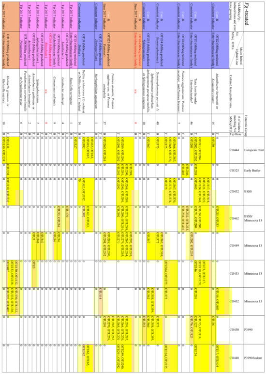 As noted above, the F. graminearum-treated silks produced 238 OTUs, while the healthy silks gave rise to 271 OTUs, when the two populations were analyzed together as a complete group. Because of overlap between the two treatments, the total number of unique OTUs was 389. The number of OTUs from the healthy silks when analyzed alone was 221 [], compared to 271 here; this discrepancy is due to the fact that some 16S sequences from the healthy silk population were assigned to additional OTUs when analyzed alongside the F. graminearum-treated silks because they matched multiple longer or higher quality 16S sequences from the F. graminearum-treated population that were revealed to be distinct. After the assignments were updated, healthy silks gave rise to 26 OTUs which were found in three or more genotypes, whereas the F. graminearum-treated silks produced 48 OTUs with this level of prevalence.