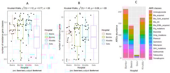Comparison of the number of resistance gene classes (A), number of resistance genes (B), and relative abundance of resistance gene classes (C) of Klebsiella pneumoniae isolated from the different hospitals. Bwera: Bwera General Hospital, Bombo: General Military Hospital Bombo, Gulu: Gulu Regional Referral Hospital, and Kiruddu: Kiruddu National Referral Hospital.