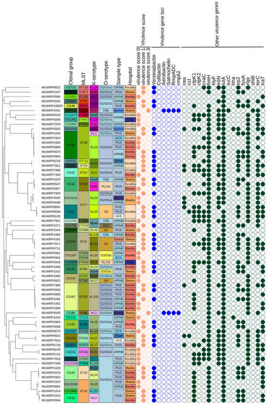 The threat by MDR K. pneumoniae has been recently heightened by their convergence with highly virulent strains. K. pneumoniae is thought to have evolved through two different evolutionary pathways, often defined as pathotypes: multidrug-resistant K. pneumoniae (MDR-Kp) and hypervirulent K. pneumoniae (hvKp) []. We found that most of the isolates in this study had several virulence factors including the most common ones. We looked for the genes’ encoding for the siderophores-salmochelin (iro), aerobactin (iuc), and yersiniabactin (ybt)—the iron-foraging molecules—and scored them as defined; we identified two strains with score three, all of which had aerobactin, salmochelin, rmpADC/rmpA2 and were classified as hypervirulent based on that score. These two strains, MUWRO1041 and MUWRP4500, did not carry resistance to many antibiotics and therefore did not present any hypervirulence and multidrug resistance convergence nuances. Hypervirulence is suspected to be a multifactorial phenotype conferred by the presence of multiple virulence genes carried on large virulence plasmids, some of which simultaneously carry resistance genes [] and none of which was demonstrated in any of the isolates examined in this study.
