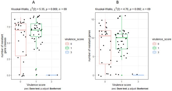 Comparison of number of resistant classes with virulence score (A) and number of resistant gene with virulence score (B).