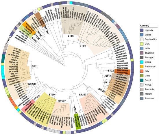 The phylogenetic relationship of the 69 Ugandan isolates was compared with contemporary isolates with sequences available in the GenBank from elsewhere in the world. The various STs grouping observed in Uganda closely grouped with strains reported elsewhere. ST11 cluster was dominant with isolates from different countries including Uganda, China, Brazil, and USA (Figure 6). Similarly, the ST14 cluster had isolates from Thailand, India, Kenya, Malawi, and Uganda. The Tanzanian isolates (SBIL01 and JAPVDK01) group together with eight isolates from Uganda in the ST39 cluster (Figure 6). The ST307 cluster contains strains from Uganda, Egypt, and the USA. The ST15 cluster contains isolates from Uganda, Kenya, and Pakistan.