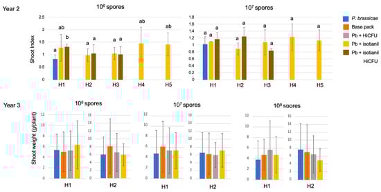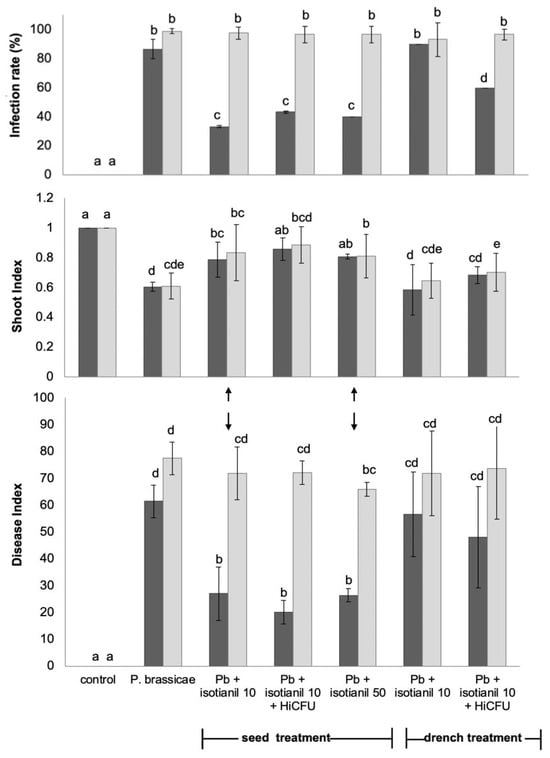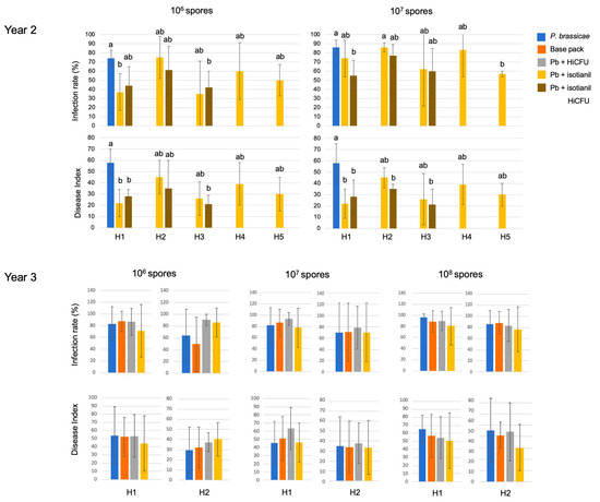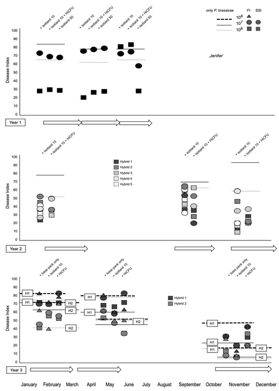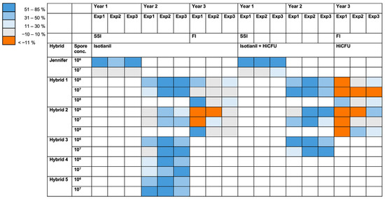 3.2. The Effect of Isotianil Is Primarily Dependent on Hybrid, P. brassicae Isolate, Spore Concentration, and the Season
