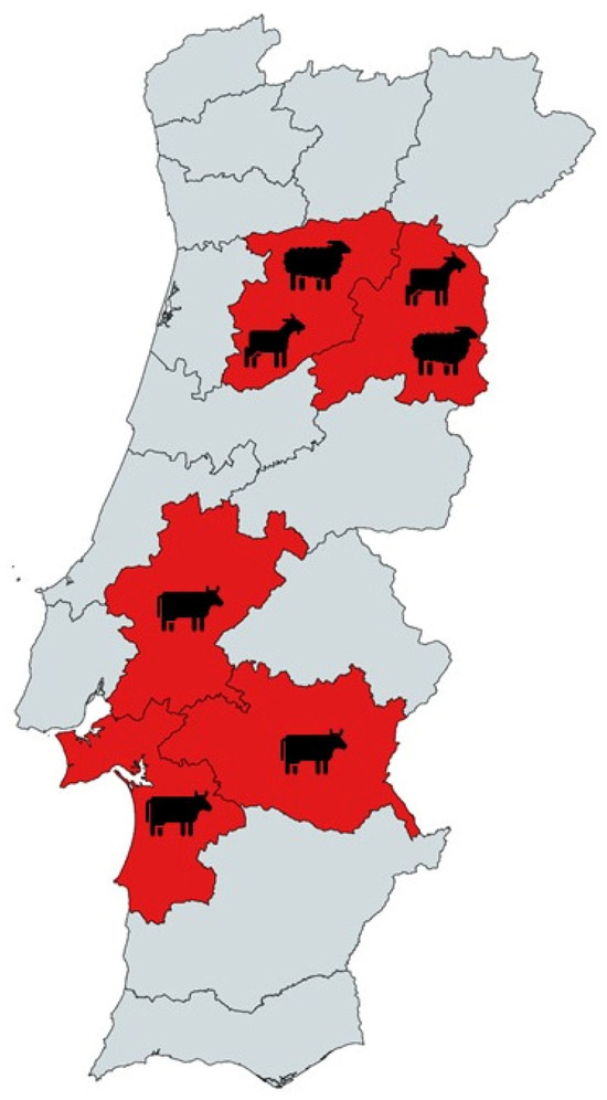 A total of 302 individual stool samples were collected. Bovine stool samples were collected in June/July 2015 from seven farms located in Setúbal, Évora, and Santarém districts, central/southern region of Portugal (Figure 1). Of the total bovine sampled (n = 166), 142 were from intensive and 24 were from extensive farming systems.