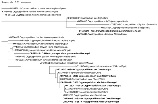Amplicons that showed positive results and matched the expected size were purified using the GRS PCR and Gel Band Purification Kit (GriSP®). Following purification, the Sanger method was utilized with specific internal primers for the target gene. Bidirectional sequencing was performed, and the resulting sequences were aligned and compared to those present in the NCBI (GenBank) nucleotide database, accessed on 15 July 2023, using the BioEdit Sequence Alignment Editor v7.1.9 software package, version 2.1. Furthermore, MEGA version X software was employed for additional analysis and interpretation of the sequences [41]. The Hasegawa–Kishino–Yano model was used to estimate the ML bootstrap values using 1000 replicates. This model was determined by MEGA version X [41] to be the most effective replacement. The sequences obtained in this study were deposited in GenBank with accession numbers OR722518 (C. parvum), OR726049 (C. ubiquitum), OR726043, OR726044, OR726045, OR726046, OR726047, OR726048 (C. xiaoi), OR722476, OR722477, OR722478, OR722479, OR722480, OR722481, OR722482, OR722483, OR722484, OR722485, OR722486, OR722487, OR722467, OR722468, OR722469 (Blastocystis sp.), and OR727793, OR727794, OR727795, OR727796 (E. bieneusi).