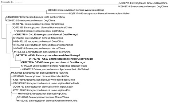 Enterocytozoon bieneusi was detected in 4 out of the 302 samples, with a total occurrence of 1.32% (95% [CI]: 0.36–3.36). All E. bieneusi were exclusively found in goats, all retrieved from the slaughterhouse, with an occurrence of 6.35% (4/63, 95% [CI]: 1.76–15.47%). BLAST analyses revealed that sequences shared 95.67–100% identity with E. bieneusi sequences from animals from China (goat, fallow deer, and horse, KP262365, MT895455, and MN704934).