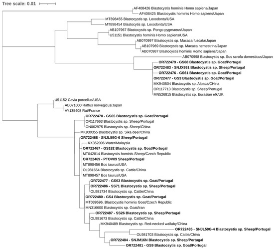 In this study, Blastocystis sp. was found in both sheep and goats, occurring in 9.59% and 12.70% of these animals, respectively. In comparison to the available data, the occurrence in sheep of 9.59% (7/73, 95% [CI]: 3.94–18.76) was lower than that reported in Greenland (14%), Iran (32.0%), Turkey (38.2%), and China (16.26%) [51,52,53,54]. Interestingly, the prevalence of Blastocystis sp. in sheep remains relatively understudied in Europe. Also, interestingly, all Blastocystis sequences from sheep were classified as Blastocystis sp. In the present study, goats presented a higher occurrence of Blastocystis than sheep, 12.70% (8/63, 95% [CI]: 5.65–23.56), with all of cases being classified as Blastocystis sp. In this study, Blastocystis occurrence in goats was again lower when compared to Malaysia (30.9%) [55], Italy (44.4%) [56], and China (33.63%) [57]. This could be due not only to differences in diagnostic performances but also to genetic and eco-epidemiological differences between sampled animals which could ultimately influence the circulation of this agent. Noteworthy, animals can serve as reservoirs for Blastocystis sp. due to its poor host specificity and zoonotic potential. This parasite is commonly detected in fecal samples from both animals and humans worldwide and is estimated to cause nearly one billion human infections, making it one of the most commonly found parasites in humans [31,52,58]. Despite our findings, one cannot exclude the possibility of these numbers underrepresenting the true scenario of these enteropathogenic agents circulating in healthy domestic ruminants in Portugal. When analyzing stool samples, care should be taken since PCR inhibitors can be found, such as phenolic compounds, glycogen, fats, cellulose, constituents of bacterial cells, nontarget nucleic acids, and heavy metals, leading to false negatives [59].