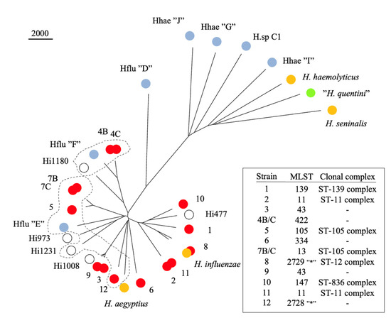 - Meats, E.; Feil, E.J.; Stringer, S.; Cody, A.J.; Goldstein, R.; Kroll, J.S.; Popovic, T.; Spratt, B.G. Characterization of encapsulated and noncapsulated Haemophilus influenzae and determination of phylogenetic relationships by multilocus sequence typing. J. Clin. Microbiol. 2003, 41, 1623–1636. [Google Scholar] [CrossRef]