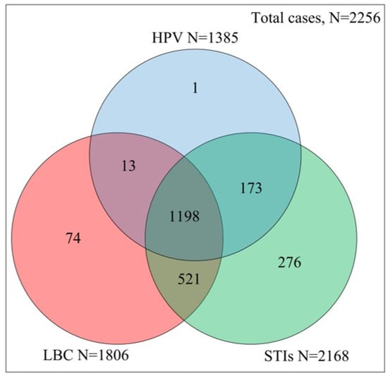 In this manuscript, we are presenting datasets from eligible individuals for whom STI assay results as well as LBC and/or HPV genotyping results were available. In order to obtain a more robust dataset, we did not exclude cases for which some individual exam results were missing (for example, due to insufficient biological material due to prior consumption for other examinations or failure of the molecular tests); these cases were used in pairs for those parts of the analysis where results were available and valid statistical tests could be obtained (refer to Figure 1 for a Venn diagram indicating the examinations presenting simultaneously valid results).