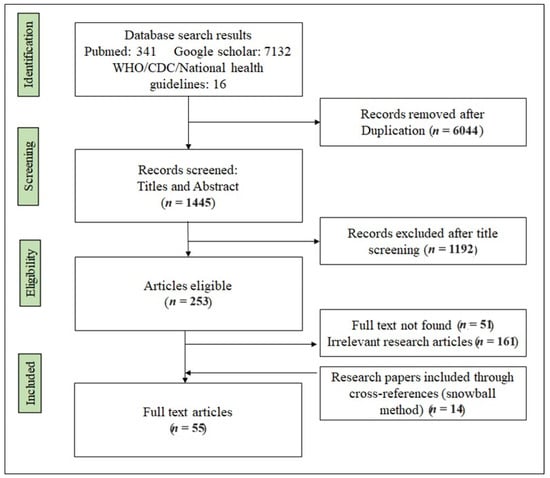 A comprehensive initial search yielded a total of 7489 articles. After removing duplicates and applying the eligibility criteria, 1445 articles remained. Following title and abstract screening, a final selection of 55 articles, guidelines, and related resources was included in the current review. The search strategy diagram illustrating the selection process of the studies is presented in Figure 1.
