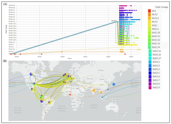 Mpox lineage distribution: (A) phylodynamics over the years and (B) global transmission (GISAID.org, as of 8 June 2023).