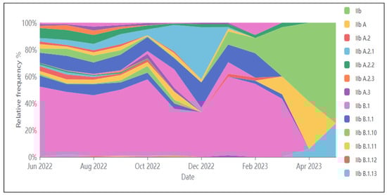 Relative frequencies of Mpox lineages over time (GISAID.org, as of 8 June 2023).