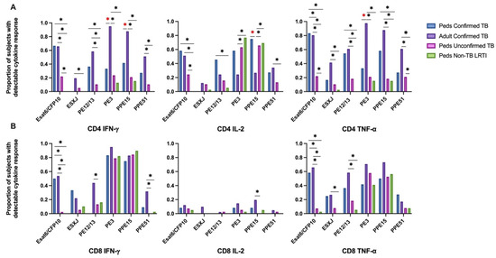 Proportion of children and adults with detectable CD4+ and CD8+ T-cell cytokine response to six mycobacterial antigens. PBMC isolated from children with confirmed (n = 12), unconfirmed TB (n = 41), non-TB lower respiratory tract infection (n = 39) and adults with confirmed TB (n = 41), were thawed in batches, rested overnight, and CD4+ and CD8+ T-cell production of IFN-γ, IL-2, and TNF-α in response to 6 peptide pools representing mycobacterial antigens quantified by intracellular flow cytometry following 18 h of stimulation (ICS). A positive response to each peptide pool was defined as ≥0.05% of CD4+ (A) or CD8+ (B) T cells producing a cytokine following background correction. * Indicates adjusted p-value ≤ 0.05. * Illustrates significant differences between adults and children with confirmed TB.