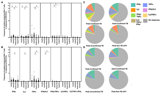 Distribution of CD4+ and CD8+ T cells that produce cytokines in response to PE3. Median percentages (frequencies) of CD4+ (A) and CD8+ (B) T cells that produce IFN-γ, IL-2, or TNF-α in response to PE3 peptide pool were quantified by ICS (n = 12 PedTB; n = 41 AdultTB; n = 38 PedUncTB; n = 39 PedLRTI). Background correction (subtraction of the unstimulated/resting responses) was performed, and responses <0.05% set to zero. Comparisons of medians among cohorts were performed using Kruskal–Wallis test; post hoc comparisons were performed using Dunn’s test of multiple comparisons. Shown are medians with IQR. Pie charts visualize the fraction of donors within each cohort with unresponsive CD4+ (C) and CD8+ T cells (D) (grey slices). The colored slices visualize the fraction of exclusively single, double, or triple positive CD4+ (C) or CD8+ (D) T cells among those participants with a detectable cytokine response within each cohort. * Indicates adjusted p-value < 0.05.