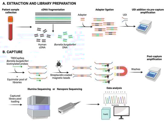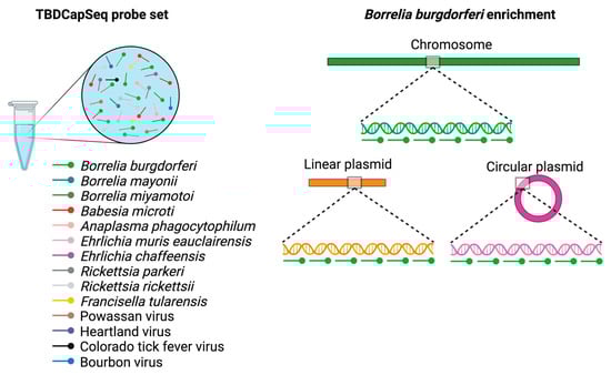 The utility of this approach has been documented for viral and bacterial agents, and the development of the TBD capture sequencing assay (TBDCapSeq) demonstrated its superior capacity for the detection of tick-borne pathogens in ticks, rodents and clinical specimens with a sensitivity equal to, or occasionally, superior to PCR [,]. Capture sequencing can provide a substantial improvement over PCR for the detection of B. burgdorferi in blood, and it can simultaneously detect any tick-borne infection including concurrent infections [] (Figure 2).