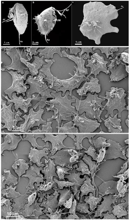 Scanning electron microscopy of the parasite T. vaginalis grown in axenic culture (a) and after contact with an inert substrate or host cell (b,c). (b) A cell was taken almost immediately after adhesion to the flask bottom. Notice that small cell-surface projections are seen, which do not occur in free cells. (c) An ameboid T. vaginalis. (d,e) SEM of T. vaginalis as a monolayer. Notice the flattened parasites presenting cell contacts with neighbors. In (e), a second layer of parasites was caught in the adhesion process (asterisks). AF: anterior flagella; Ax: axostyle; UM: undulating membrane.