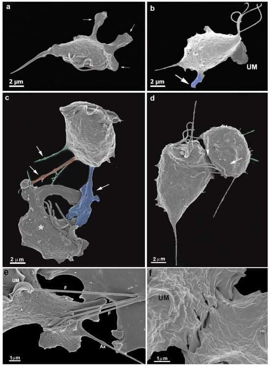 Scanning electron microscopy of T. vaginalis collected from the flask bottom after a few minutes of cultivation. Parasites were fixed in situ, washed several times, and processed for SEM. Large cell projections in blue (a–c), filopodia (orange), and cytonemes (green). (c,d) Early contacts between two parasites (arrows). Notice cell projections and changes in the shape of one cell (c, asterisk). (e,f) Cells in contact. Notice the flagella contacts with a neighboring cell (e) and close contacts between cell surfaces (f). UM, undulating membrane.