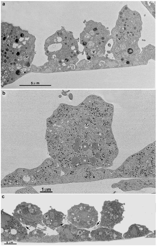 A monolayer of adhered parasites after incubation in a plastic flask. (a) The cells are firmly adhered to, forming many interdigitations. (b) In this stage, only one layer is seen. Afterward, in (c) a second layer is formed, and new cells are adhered to the first layer. Notice the presence of multivesicular bodies in vesicles inside the cells and the extracellular region (arrows). H, hydrogenosomes.