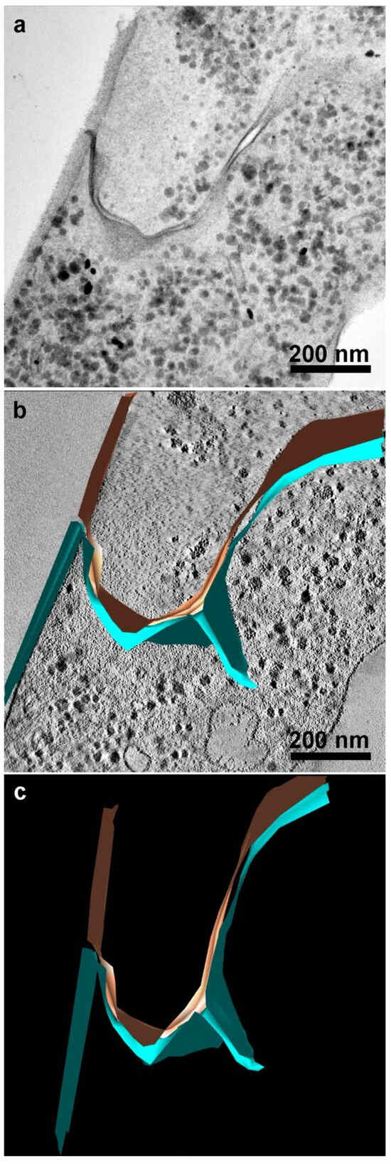 Electron tomography enabled the visualization of an inward folding or invagination in the lower layers. Upon observing the tomographic reconstruction video, it became evident that reconstructing the image was crucial to accurately perceive the folding of the plasma membrane, thereby preventing any confusion with a potential fusion of regions (Supplementary Movie S1).