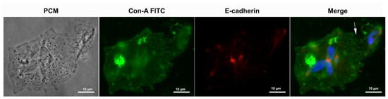 Labeling observed in whole cells and isolated cytoskeletons of T. vaginalis with the E-cadherin polyclonal antibody (Invitrogen, Waltham, MA, USA) may not target a membrane or cadherin-like protein. Additionally, we conducted membrane labeling using Concanavalin A, which recognizes alpha-mannose residues (Figure 6), and the labeling pattern remained consistent, suggesting an association with the cytoskeleton rather than the membrane or the cell–cell contact region.