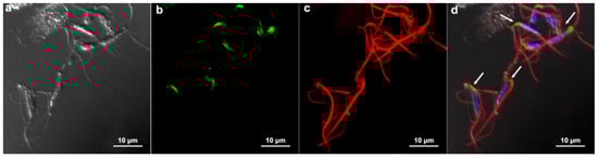 We also decided to look for known proteins present in the junctional areas of the cells that form epithelia in metazoan cells. We tested for claudin, occludin, and ZO-1 with commercial antibodies—all results were negative. Regarding tests with anti-cadherin antibodies, we started with a recent group publication [], which found a protein similar to cadherin using bioinformatics. We used various commercial pan-cadherin antibodies. A positive reaction was observed, albeit not in the cell–cell contact regions, but in the anterior portion near the communication interface between the cytoskeleton and the plasma membrane (Figure 6 and Figure 7, Supplementary Figure S1). When we tested enriched fractions of the T. vaginalis cytoskeleton after detergent-based extraction using anti-tubulin and anti-cadherin antibodies, we noticed a co-localization of the labeling (Figure 7), indicating a non-specificity of the commercial anti-cadherin antibodies.