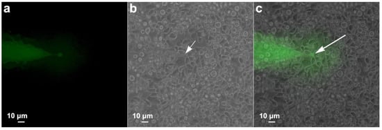 In order to verify whether there was a passage of information between adjacent cells that formed the monolayer, as occurs in gap junctions, we performed an experimental injection of the fluorescent dye Lucifer Yellow in one cell and took pictures 2 min later to see if the dye was found in neighboring cells—the results were negative. The dye was restricted to the injection site (Figure 8).