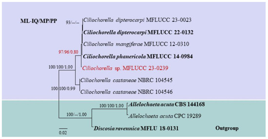 Based on the combined ITS, 28S, and β-tub sequence data of Ciliochorella, our isolate, MFLUCC 23-0239, clusters with other Ciliochorella species and forms a distinct lineage with the larger subclade in which reside C. dipterocarpi, C. mangiferae, and C. phanericola (97% ML-IQ, 96% MP, 0.88 PP) (Figure 1).