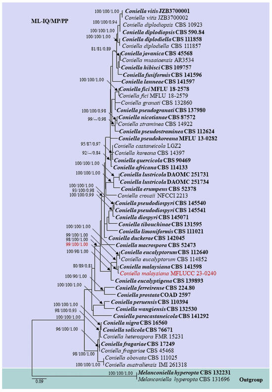 Maximum likelihood phylogram based on the combined ITS, 28S, Rpb2, and tef-1α matrices of Coniella. Bootstrap support values (ML-IQ ≥ 80%) and maximum parsimony (MP ≥ 80%), and Bayesian posterior probabilities (PP ≥ 0.80) are given above the branches or at the nodes as ML-IQ/MP/PP. Hyphen (-) indicates bootstrap support values below 80% for ML-IQ and MP, and posterior probabilities below 0.80. Melanconiella hyperopta (CBS 132231 and CBS 131696) are selected as outgroups. Ex-type and reference strains are in bold, and our isolate is in red.