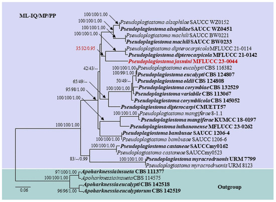 Based on the combined ITS, 28S, β-tub, Rpb2, and tef-1α sequences of Pseudoplagiostoma, our isolate, MFLUCC 23-0044, groups with other species of Pseudoplagiostoma and forms a sister clade with P. dipterocarpicola (MFLUCC 21-0142 and MFLUCC 21-0114) with 35% ML-IQ and 32% MP bootstrap support, and 0.95 PP support (Figure 4).