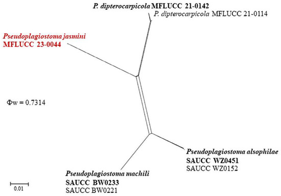 The LogDet transformation and splits decomposition options were selected while configuring the PHI test. The analysis yielded a threshold over 0.05 (Φw = 0.7314) for the new species, Pseudoplagiostoma jasmini, indicating no significant recombination (Figure 5).
