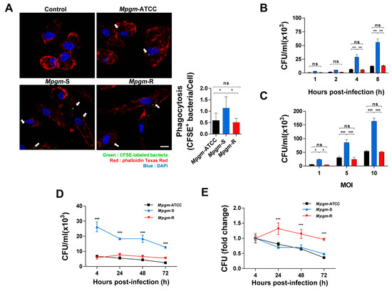 The capacity to multiply and persist within macrophages is indispensable for the virulence of intracellular pathogens [11]. We confirmed that Mpgm is an intracellular pathogen by labeling cells with CFSE and infecting BMDMs. CFSE staining was performed for 2 h, and BMDMs were infected with CFSE-coupled bacteria at an MOI of 5 for 4 h. Cortical F-actin and nuclei were stained with Phalloidin Texas Red and DAPI, respectively, and then analyzed using confocal microscopy. Confocal microscopy analysis showed significantly higher amounts of CFSE-bound bacteria during Mpgm-S infections than during Mpgm-ATCC and Mpgm-R infections (Figure 2A). Additionally, when assessing the number of CFSE-bound bacteria per cell, Mpgm-S infection led to approximately three times more bacteria per cell than Mpgm-ATCC and Mpgm-R infections. Mpgm-ATCC and Mpgm-R infection led to similar levels of CFSE-bound bacteria (Figure 2A).