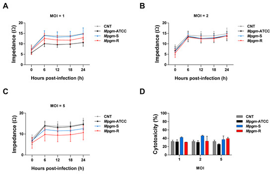 Cell viability was determined using Maestro Z (Axion Biosystems, Atlanta, GA, USA). Before cell seeding, a baseline was measured with the culture medium. A total of 5 × 104 cells per well were seeded in 96-well plates and incubated overnight. After incubation, the cells were washed twice with DPBS and infected with Mpgm at MOIs of 1, 2, or 5 for 24 h. The acquired data were analyzed using dedicated software to quantify cell viability changes over time. The Maestro Z quantification of cell viability uses impedance. Impedance is the principle by which electrical signals are transmitted to electrodes, and the 96-well cytoview-Z plate has electrodes built into it, which allows for electrical signals to be recognized. Impedance measures the degree to which electrical signals are blocked by the electrode and cell interface. When a cell attaches, the electrical signal is blocked and detected as an increase in impedance, and when a cell dies, it is detected as a decrease in impedance. The results of these experiments were reported as impedance values ± standard deviation (SD) per 5 × 104 cells.