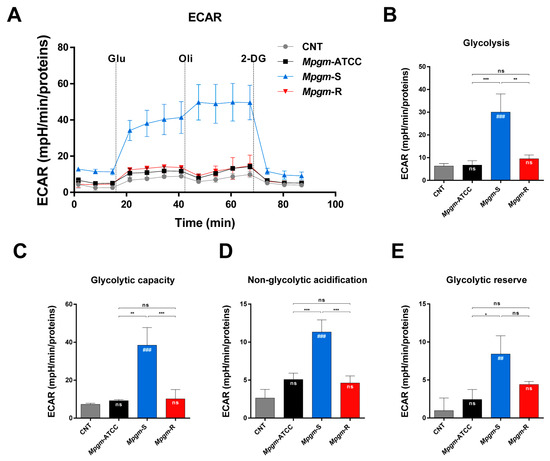 Extracellular acidification profiles and glycolytic parameters of BMDMs infected with M. peregrinum. (A) Real-time extracellular acidification (ECAR) of BMDMs infected with Mpgm at an MOI of 2 for 24 h. (B) Quantification of glycolysis activity, (C) glycolytic capacity, (D) nonglycolytic acidification, and (E) glycolytic reserve. The real-time extracellular acidification profiles and parameters are representative of three independent experiments. Data in B–E were analyzed via a one-way ANOVA with Tukey’s multiple comparisons test. Data are presented as the mean ± SD and are the cumulative results of three experiments (ns: not significant, * p < 0.05, ** p < 0.01, *** p < 0.001, ## p < 0.01, ### p < 0.001 vs. CNT).