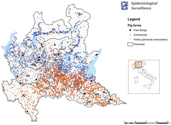 Northern Italy is an area of intensive pig farming, and Lombardy, a region bordering Piedmont, is home to about 50% of the national pig population. The Lombard pig sector is of economic importance for the entire country, also in terms of the processing industry, which aims to produce high-quality pork products. Therefore, the presence of an epidemic disease in pigs could adversely affect the entire pig sector.