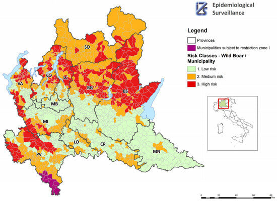 In Lombardy, data on wild boars and their distribution are scarce, or in any case, their availability is not homogeneous throughout the regional territory; however, population data is necessary when undertaking control actions against a disease. To overcome this drawback, indicators have been constructed that attempt to best represent the presence of wild boar in the area, with the aim of identifying the municipalities in which the transmission of the virus from wild to domestic pigs is most likely, and to apply appropriate control measures. For each municipality, the risk posed by the presence of wild boar was assessed and then combined with the risk posed by the presence of domestic pigs. Based on the results, the municipalities were divided into four risk categories: low, medium-low, medium-high, and high (Table 4). The first case of ASF in wild boars, indeed, occurred on the border with Piedmont, in a municipality classified by the study as having a high risk of transmission, and the first ASF outbreak in Lombardy occurred in a small fattening farm in the restricted zone, in an area where the disease had already been identified in wild boars. However, it is worth remembering that, at the time of the study, pigs from family farms had already been slaughtered in that area in order to avoid the spread of the infection from feral to domestic pigs. In these farming conditions, after the elimination of pigs for household consumption, small fattening farms were, resultingly, the most exposed to the risk of introducing ASFV.