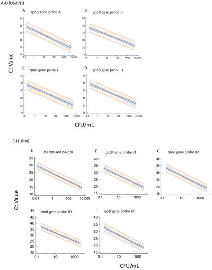 (A–D) Linear regression for the rpoB gene with detection probes A, B, C, and D (US-IVD), respectively. (E–I) Linear regression for the IS and the rpoB gene with detection probes B1, B2, B3, and B4 (Ultra), respectively. The orange area indicates the 95% confidence interval.