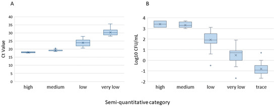 Semi-quantitative category reported on the Ultra test plotted against the lowest Ct values among the 4 rpoB gene probes for each sample (A) and the corresponding CFU/mL (log10) (B). The box represents the interquartile ranges from the lower quartiles (Q1) through the upper quartiles (Q3). The median and the mean are displayed as a solid horizontal line and × inside the box, respectively. The outliers are shown as data points outside the standard deviation bar.