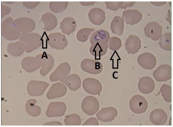 Blood smear from a dog infected with B. canis: A—eccentrocyte, B—Babesia merozoites, C—spherocyte.