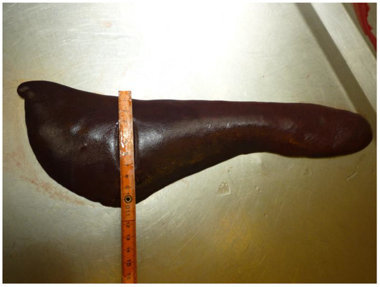 Enlarged spleen from a 4-month-old female German Shepherd which did not survive B. canis infection.