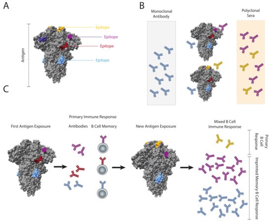 These aspects of imprinting are, however, in some ways a double-edged sword. In many cases, the memory response to an antigen with moderate sequence homology to the originally encountered antigen can be less effective at viral neutralization than a naive response. In a primary immune response, naive B cells are activated followed by division, class switching and affinity maturation of B cell clones within the germinal center [44,45,46]. Dominant clones with high antigen affinity emerge via competition within the germinal center [44,47]. Alternatively, memory B cells responding to previously encountered epitopes are activated and expand more rapidly than the naive B cells responding to new epitopes, IgG secreting B cell clones recognizing new epitopes are less abundant. This results in lower concentrations of IgG against the newer variant epitopes seen by naive B cells, and paradoxically a less effective immune response to the non-identical virus [48]. Such ongoing mutation of circulating, seasonal strains of influenza are termed antigenic drift. This phenomenon implies that initial epitope exposure will create B-cell memory, and this imprinting impedes the production of efficient neutralizing antibodies after subsequent exposure to mutated epitopes. Such mutations occur under selective pressure in individuals with antibody-mediated immunity and are often present on the viral binding site for the host protein [8]. Finally, an imprinted B cell immune response to a newer viral surface protein can serve to facilitate, rather than block, viral infection through antibody dependent enhancement (ADE). ADE occurs when non-neutralizing antibodies bind to a pathogen’s surface epitopes and allow it to more easily infect host cells. This phenomenon has already been observed in cases of animal models for influenza [49], and is currently being studied in relation to SARS-CoV-2 [50,51].