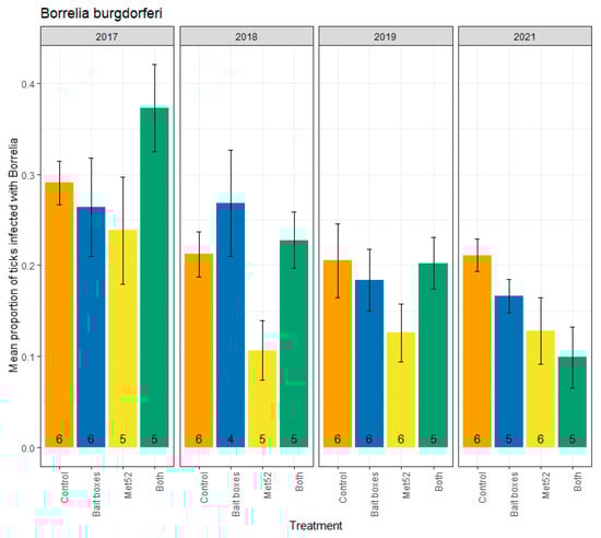 Mean proportion of blacklegged ticks, Ixodes scapularis, infected with Borrelia burgdorferi, as a function of the acaricidal treatment imposed on residential neighborhoods, over the four years ticks were sampled. Sampling did not occur in 2020 due to COVID-19 restrictions. On the x-axis, Control indicates neighborhoods that had placebo controls for both TCS bait boxes and Met52, Bait boxes indicates neighborhoods that had active bait boxes but placebo Met52, Met52 indicates neighborhoods that had active Met52 but placebo bait boxes, and Both indicates neighborhoods that had active TCS bait boxes and active Met52. Error bars are standard errors. Numbers on bars are the number of neighborhoods (out of 6) for which we were able to assess infection prevalence for at least 10 ticks.